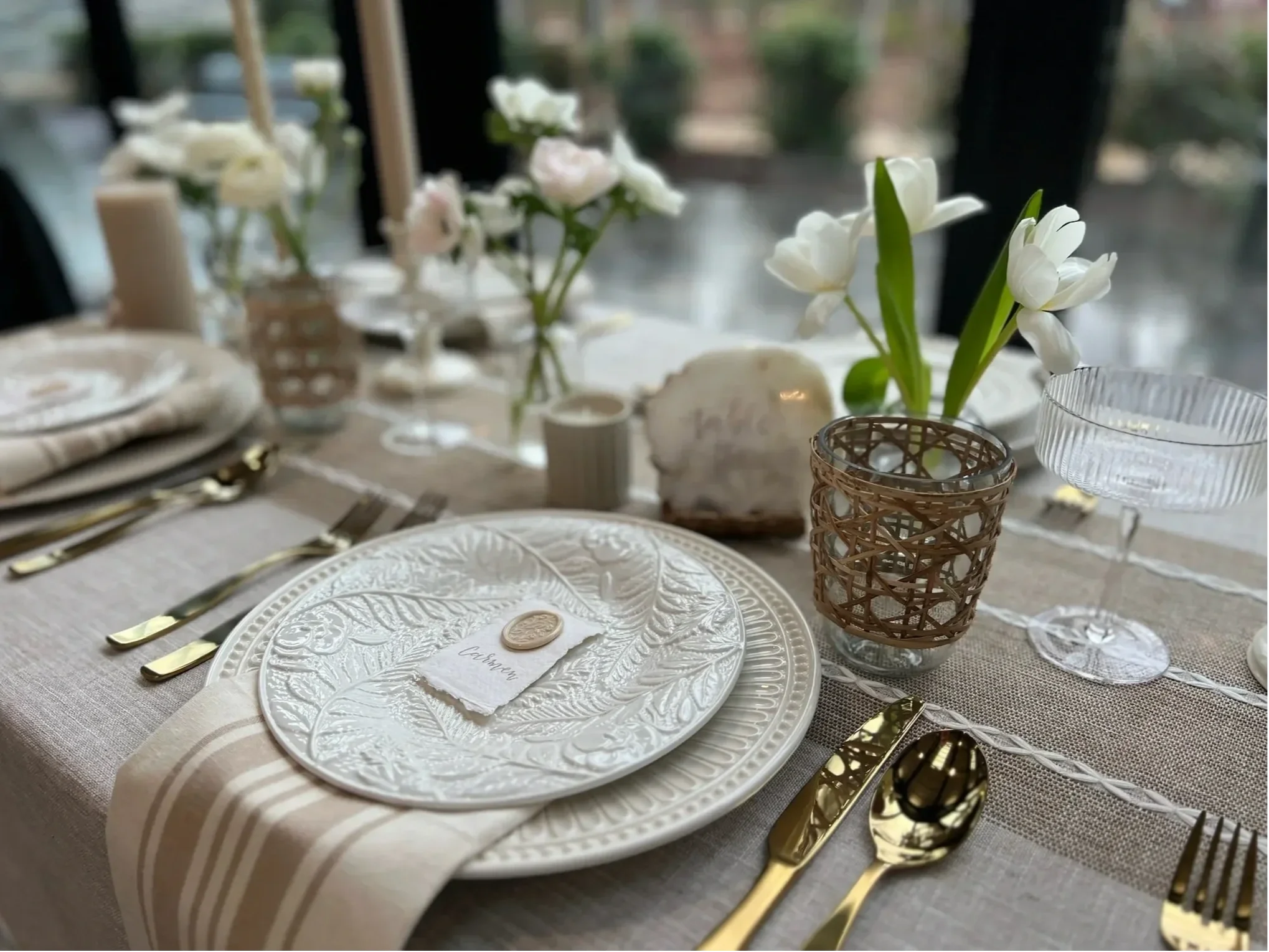 Elegant tabletop decor: fine china, glassware, flatware, and linens